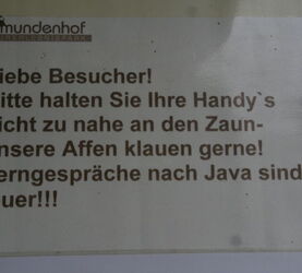Die gesamte Anlage ist von einem ca. 2,20m hohen Zaun umringt, der direkt an den Besucherweg grenzt. Mehrfach gespannte E-Litzen und Überhang sorgen dafür, dass die Affen nicht hinaus gelangen können. Durch eine Beschilderung wird sowohl auf den Strom, als auch darauf aufmerksam gemacht, das man doch bitte NICHT füttert und weder Hände noch Gegenstände durchreicht oder hineinwirft! Mehrere Schautafeln zeigen Bilder von zerstörten Handys, Kameras und Kinderspielzeug aber auch von Verletzungen, die sich die Tiere zugezogen haben. An 2 Stellen ist der Zaun auf Hüftniveau abgesenkt um einen Gitterfreien Blick zu schaffen.