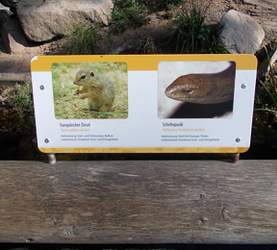 Die Anlage ist sehr gut beschildert, zu jedem Bewohner gibt es ein kleines Schild mit Foto.