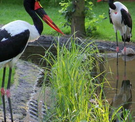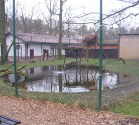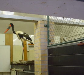 Der Innenraum für die Störche ist 30 m² groß und ca. 3,80 m hoch, darin befindet sich auch eine Nistgelegenheit. Diese ist ca. 2 m x 2,4 m und befindet sich in 1,50m Höhe. In der Außenanlage befindet sich ein Teich, welcher ca. 50 m² groß und ca. 70 cm tief, an der tiefsten Stelle ist.