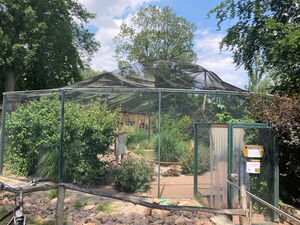 Diese sehr schön in die Tiergartenlandschaft eingepflegte Volierenanlage wurde in den Jahren 2018 - 2019 errichtet und fertiggestellt. Hierbei wurde sehr viel in Eigenleistung umgesetzt, z.B. durch den Förderverein, der den Innenausbau übernahm und die Bepflanzung, die Einrichtung errichtete und sich maßgeblich bei der Finanzierung beteiligte, aber auch regionale Firmen waren beim Bau beteiligt. Die Voliere besteht ringsum aus Stahldraht, welcher durch eine Netzkonstruktion überdacht wurde. Dies bietet wenig Verletzungsrisiko beim eventuellen Auffliegen der Tiere. Die Anlage hatte einen Kostenumfang von ca. 75.000 €.