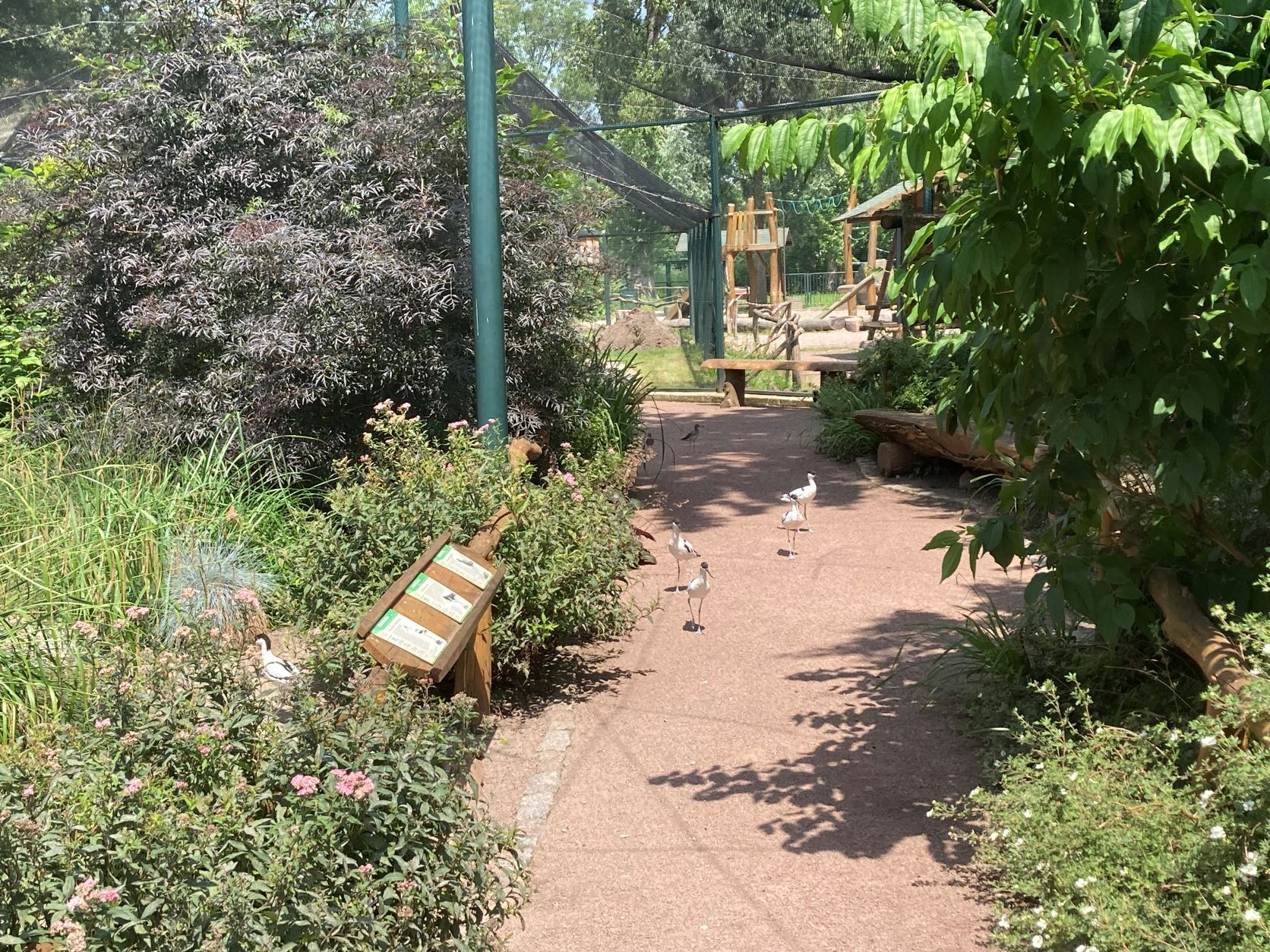 Für die Besucher geht es durch einen Schleuseneingang der zusätzlich mit Lamellen gesichert ist in die Voliere. Der Weg ist mit einem Eschenholz Zaun eingefasst, welches hart und langlebig ist. Es wurde ebenso möglichst viel Bruch- und eigen Holz verwendet, um Sitzstangen, Die Containerverschalung und Holzelemente zu bauen. Der Besucherweg selbst ist barrierefrei und bietet mit einer Sitzgelegenheit zum Verweilen ein.