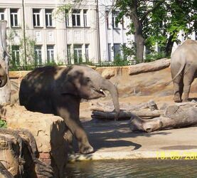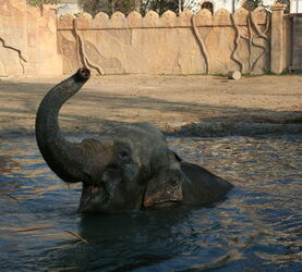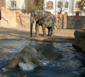 Setzt man nun seinen Weg fort, kommt man an einer alten Elefantenkiste vorbei, welche dazu einlädt sich etwas näher zu informieren. Und schon steht man vor dem Eingang zum Elefantenhaus, welcher den Eindruck einer alten verfallenen, indischen Tempelanlage erweckt. Treten wir nun ein, eröffnet sich vor uns eine geräumige Innenanlage mit Naturboden und Innenbadebecken. Für die Besucher sind Einblicke in verschiedenen Ebenen geschaffen worden. Im oberen Besucherbereich des Hauses befindet sich eine Anlage für Tupaias, eine weitere Voliere für diverse Vogelarten erstreckt sich über beide Etagen. Im unteren Bereich des Hauses befindet sich das Schuppentiergehege. Das absolute Highlight ist die Unterwasserscheibe, wo man den Tieren hautnah beim Baden zuschauen kann. Ein Tunnel führt uns nun unter der Elefantenanlage wieder nach draußen. Das gesamte Haus ist komplett behindertengerecht ausgelegt. Überall gibt es zahlreiche informations Möglichkeiten und interaktive Spiele.