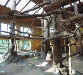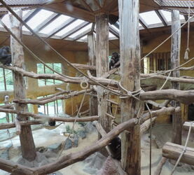 Die Innenanlage der Schimpansen ist mit 250 qm sehr geräumig. Sie ist auch ca. 8m hoch und sehr gut eingerichtet. Zwei Schieber führen ins Außengehege, 4 in die Absperrgehege. Der Boden ist strukturiert zu den verschieden Abläufen hin, was das Reinigen machen erleichtert. Termitenhügel zum Befüllen sind in der Anlage vorhanden, sowie Futterklappen zur Fütterung.