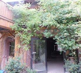Die Außenanlage ist mit über 800qm sehr schön und sehr gut strukturiert! Verschiedene Ebenen, viele Klettermöglichkeiten und ein Pflanzenbewuchs, der sehr gut gedeiht! Die Pflanzen müssen sogar regelmäßig zurück geschnitten werden. Trotz "Benutzung" der Schimpansen. Die Anlage ist mit einem Wassergraben umgeben, der 6-8 m breit ist und ca. 2m tief. Die Schimpansen haben eine Tränke am Fuße der Tierpflegerbrücke, befüllbar vom Pflegergang. Am Uferrand der Schimpansen ist ein Netz eingebaut. Eine Stromlitze umgibt die Anlage gleich hinter dem Netz. Der gesamte Strom ist auf 2 Kreisläufe gelegt und mit einem Handyalarm gekoppelt. Im Wassergraben leben Goldfische und Karpfen. 2 Brücken führen ins Gebäude. Eine Brücke für die Tierpfleger und eine größere für die Schimpansen. Auch dies alles abgesichert mit Strom, so wie auch das Haus an sich.