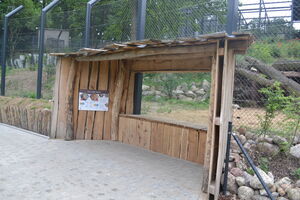 Selbst hinter den Kulissen besteht genug Platz für die Bewohner. Insgesamt stehen 6 Innenboxen und eine kleineres Außengehege zur Verfügung. Die Boxen sind im Haus auf 2 Seiten aufgeteilt. Der Boxenboden besteht aus Gussasphalt, welcher zum Einen die Gelenke der Tiere schont und zum Anderen leicht zu reinigen ist. Die Böden werden täglich mit dem im Pflegergang integrierten Heißwasserhochdruckreiniger gesäubert. Beim Bau der Boxen wurde mehrfach ein Murmeltest durchgeführt um zu gewährleisten, dass das Wasser auch wirklich in Richtung des Abflusses fließt. Jede Box ist außerdem mit einem Liegebrett in unterschiedlicher Höhe ausgestattet. Die Gitter sind so konzipiert, dass kein Tier hindurch schlagen kann. Die Türen zu den Boxen verfügen über eine Luke, worüber bei Bedarf gefüttert werden und eine Wasserschale eingesetzt werden kann. Gleichzeitig kann ein Gitterkorb für das medizinische Training eingelassen werden. Die Schieber bestehen aus einem Gitter- und einem Vollschieber und sich mechanisch zu bedienen. An den Zugvorrichtungen wurden jeweils eine Tritthilfe angebracht, was auch kleineren und leichteren Pfleger/-innen hilft, die schweren Schieber zu bedienen. Auf dem Boden im Pflegergang befinden sich 2 gelbe Sicherheitslinien und alle Bereiche sind ohne Probleme einsehbar. Da die Tiere aus Sicherheitsgründen nachts nicht auf die 2 „öffentlichen“ Außenanlagen dürfen, gibt es einen „Nachtbetrieb“ im Haus. Die angesprochene weitere 3. Außenanlage ist 123m2 groß. Diese ist vollvergittert, wodurch die Tiere diese Anlage auch nachts nutzen dürfen. Das Außengehege besitzt herausnehmbare Zaunfelder, damit eine Transportkiste einfach ans Gebäude gestellt werden kann. Zudem verfügt die Wand am Außenschieber Halteösen, damit die Kisten sicher angedockt und gesichert werden kann.