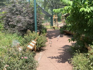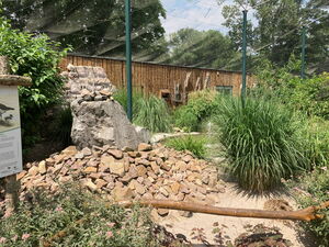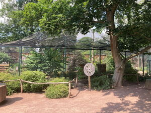 Diese sehr schön in die Tiergartenlandschaft eingepflegte Volierenanlage wurde in den Jahren 2018 - 2019 errichtet und fertiggestellt. Hierbei wurde sehr viel in Eigenleistung umgesetzt, z.B. durch den Förderverein, der den Innenausbau übernahm und die Bepflanzung, die Einrichtung errichtete und sich maßgeblich bei der Finanzierung beteiligte, aber auch regionale Firmen waren beim Bau beteiligt. Die Voliere besteht ringsum aus Stahldraht, welcher durch eine Netzkonstruktion überdacht wurde. Dies bietet wenig Verletzungsrisiko beim eventuellen Auffliegen der Tiere. Die Anlage hatte einen Kostenumfang von ca. 75.000 €.